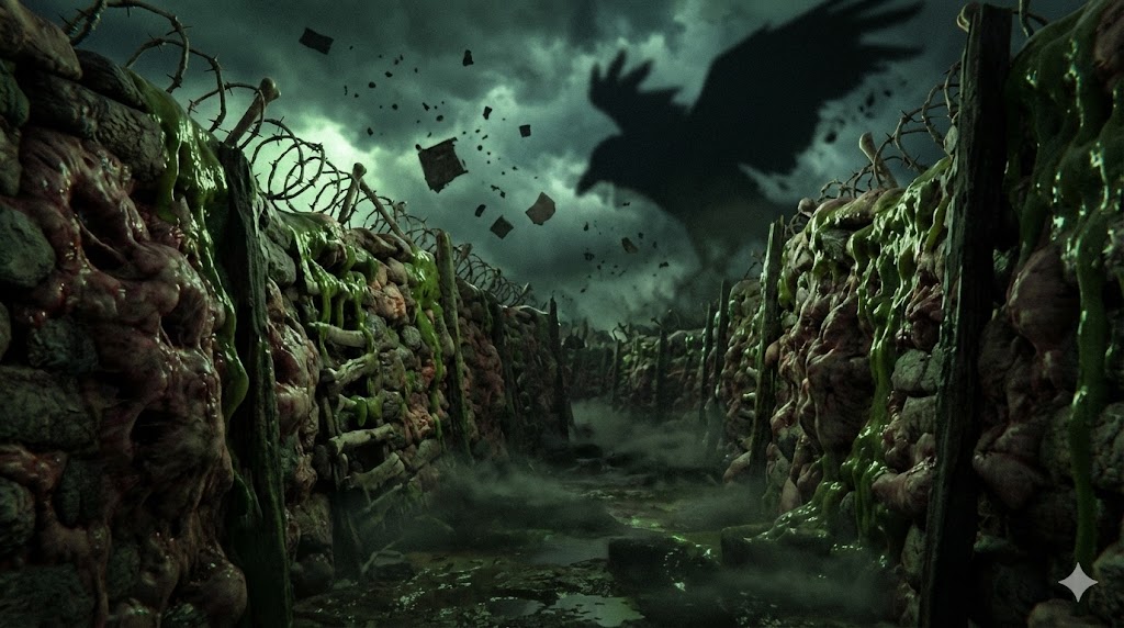 特筆すべきは、この空間内に頻繁に現れる**「第一次世界大戦の塹壕(Trench)」**のような風景である。 ぬかるんだ泥の道、腐った木板の足場、錆びついた有刺鉄線、そしてどこからともなく聞こえる砲撃のような重低音。上空には巨大な鳥とも飛行機ともつかない黒い影が旋回し、監視している。